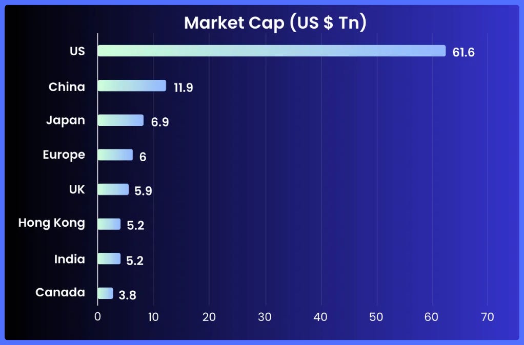 The United States continues to reinforce its position as the undisputed global equity hub, commanding the largest share of global market capitalization by a wide margin. With an equity market capitalization of approximately $61.6 trillion, the US alone accounts for ~58% of global equity market value.