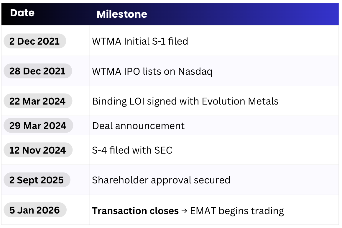 The 27-month period from LOI to the bourse (March 2024 to January 2026) reflects the complexity of regulatory approval, institutional diligence, and negotiation in the critical materials space. The WTMA team, led by CEO Daniel Mamadou, successfully navigated multiple extensions and maintained sponsor commitment through a protracted timeline.
